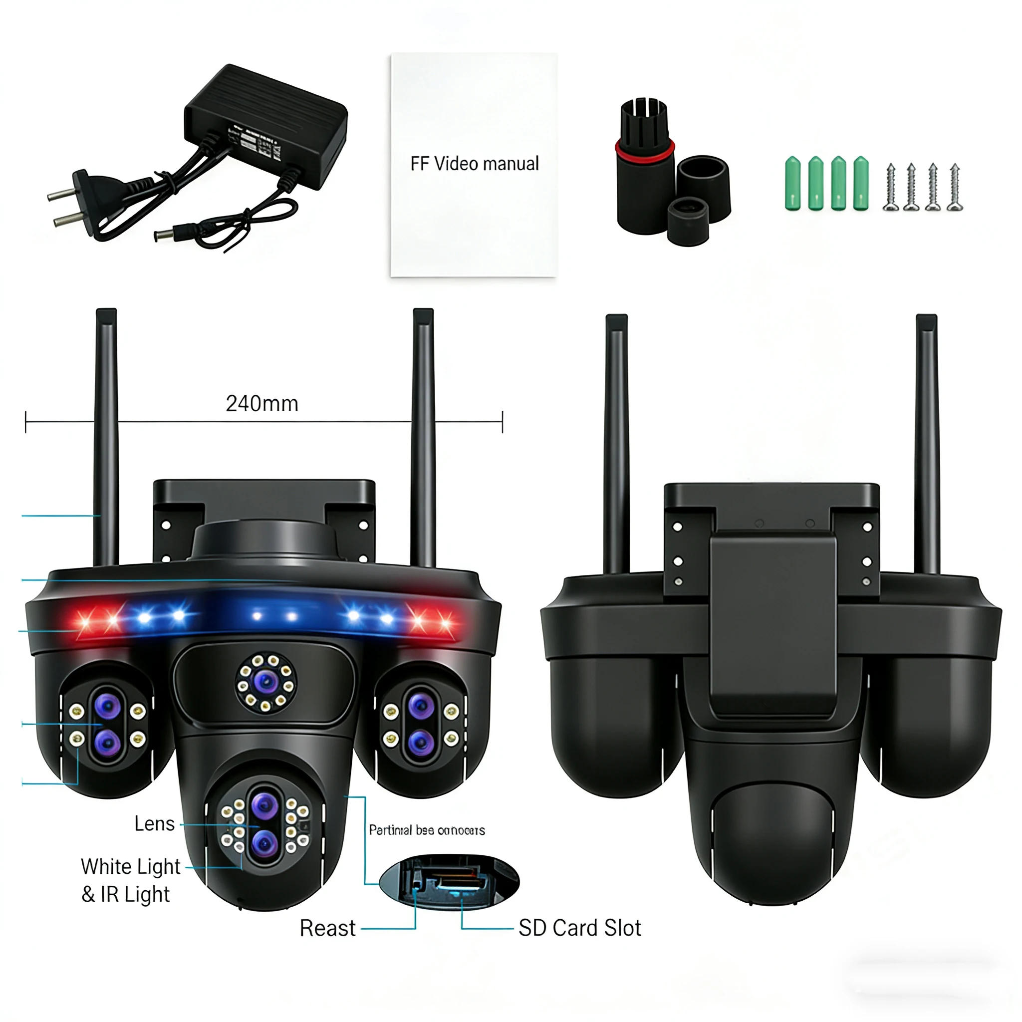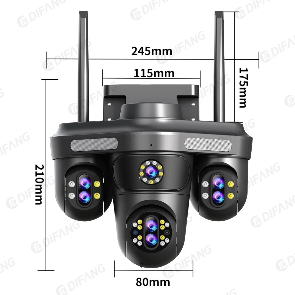 Spécifications: Résolution 35MP: Avec un nombre de pixels de 5MP pour chacun des sept objectifs, la caméra IP WiFi DIFANG 35MP capture des images avec une résolution époustouflante de 35MP, garantissant ainsi que chaque détail est limpide. Écran PTZ 7 lentilles 4: La conception innovante de la caméra comporte sept lentilles et quatre écrans, permettant une expérience complète de surveillance à 360 degrés avec la possibilité de zoomer sur plusieurs points simultanément. Zoom 10X: Avec trois caméras PTZ prenant en charge le zoom optique 10X, la caméra offre des détails et une clarté exceptionnels de loin, ce qui la rend idéale pour surveiller des zones étendues. Contrôle PTZ avancé: Les capacités de panoramique et d'inclinaison de la caméra, avec une gamme horizontale de 0 ~ 355 degrés et verticale de 0 ~ 90 degrés, sont contrôlées via l'application, offrant des réglages à distance pour des angles de vision optimaux. Smart Motion Detection: Le système d'alarme intelligent de la caméra est activé par détection de mouvement, assurant la sécurité sans alertes inutiles. Connectivité sans fil: La caméra prend en charge les ports réseau 2.4G WIFI et RJ45 pour l'accès à Internet, offrant une flexibilité dans la configuration du réseau. Caractéristiques: | Écran de la caméra 4 de sécurité à la maison | Caméra Wifi de 7 lentilles 4 écrans | ** Capacité de surveillance inégalée ** La caméra IP WiFi DIFANG 35MP est une solution de sécurité de pointe conçue pour répondre aux besoins des propriétaires de maisons et d'entreprises modernes. Sa résolution de 35MP, obtenue grâce à la combinaison de sept lentilles 5MP de haute qualité, offre un niveau de détail inégalé, vous permettant de voir chaque centimètre de votre propriété avec une clarté cristalline. Les quatre écrans de la caméra, affichant chacun une vue différente, offrent une expérience de surveillance complète et dynamique, garantissant qu'aucune zone n'est laissée sans surveillance. ** Contrôle PTZ avancé pour une visualisation optimale ** Avec trois caméras PTZ prenant en charge le zoom optique 10X, la caméra IP WiFi DIFANG 35MP vous permet de zoomer sur des objets à distance, ce qui la rend idéale pour surveiller des zones étendues. Les capacités de panoramique et d'inclinaison de la caméra, contrôlées via l'application, permettent des ajustements à distance pour des angles de vision optimaux, vous permettant de garder un œil sur tous les coins de votre propriété. Que vous surveilliez votre porte d'entrée, votre arrière-cour ou tout autre endroit, le contrôle PTZ avancé de la caméra vous assure un contrôle total de votre configuration de surveillance. ** Sécurité intelligente avec alarme de détection humaine ** La fonction de détection de mouvement intelligente de la caméra IP WiFi DIFANG 35MP est conçue pour détecter les mouvements humains, garantissant que la sécurité n'est pas compromise par des alertes inutiles. Cette fonctionnalité, lorsqu'elle est activée, peut être personnalisée pour se concentrer sur des zones spécifiques, ce qui en fait un outil idéal pour surveiller les zones ou les entrées à fort trafic. Le système d'alarme avancé de détection humaine de la caméra témoigne de sa capacité à fournir des solutions de sécurité intelligentes, en gardant votre propriété sûre et sécurisée.