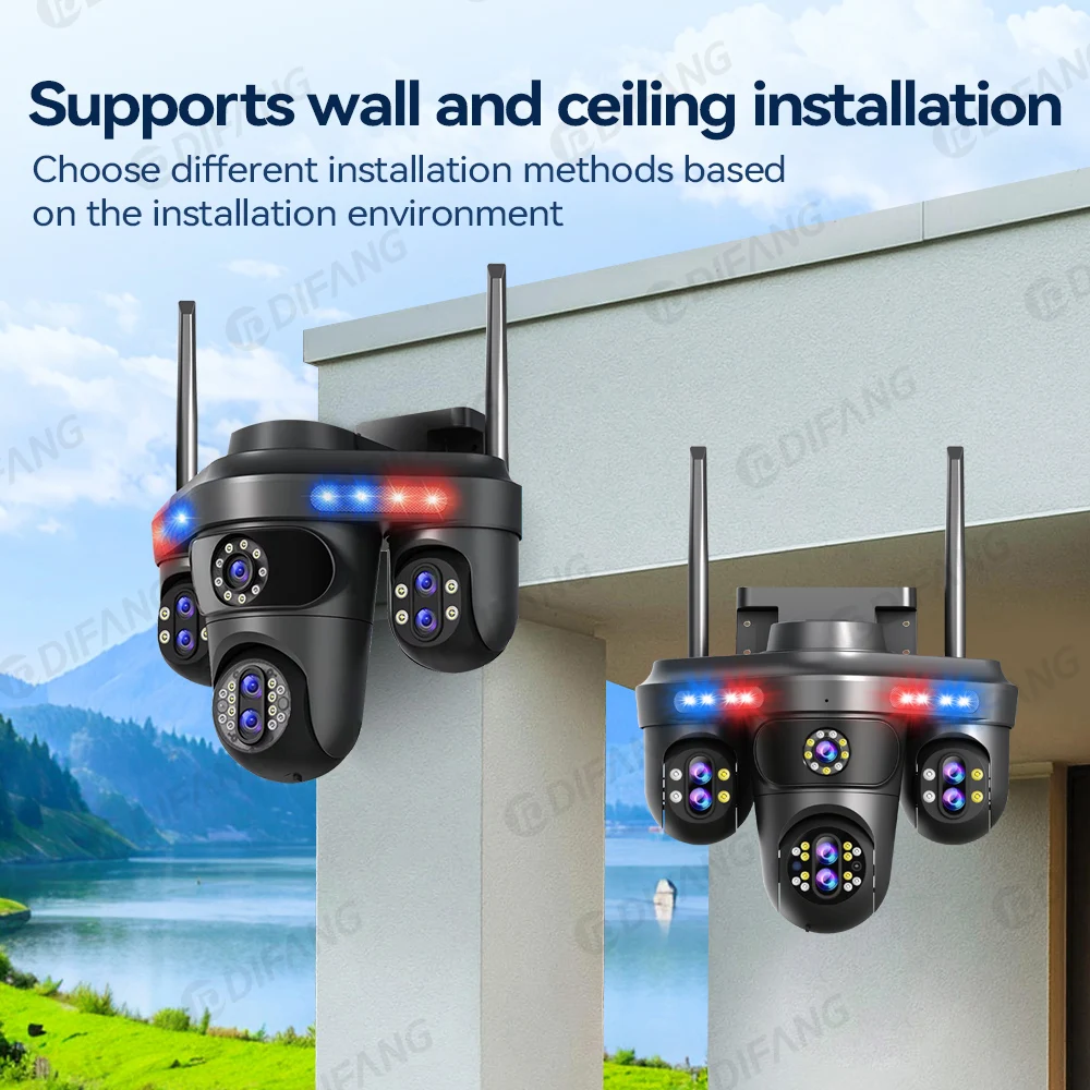 * Cette caméra de surveillance dispose d’un total de 7 objectifs, d’une caméra fixe et de trois caméras PTZ.Il réalise une surveillance complète en temps réel grâce à quatre écrans.Les trois caméras PTZ disposent d’un zoom optique 10x et peuvent être tournées à distance via l’application.